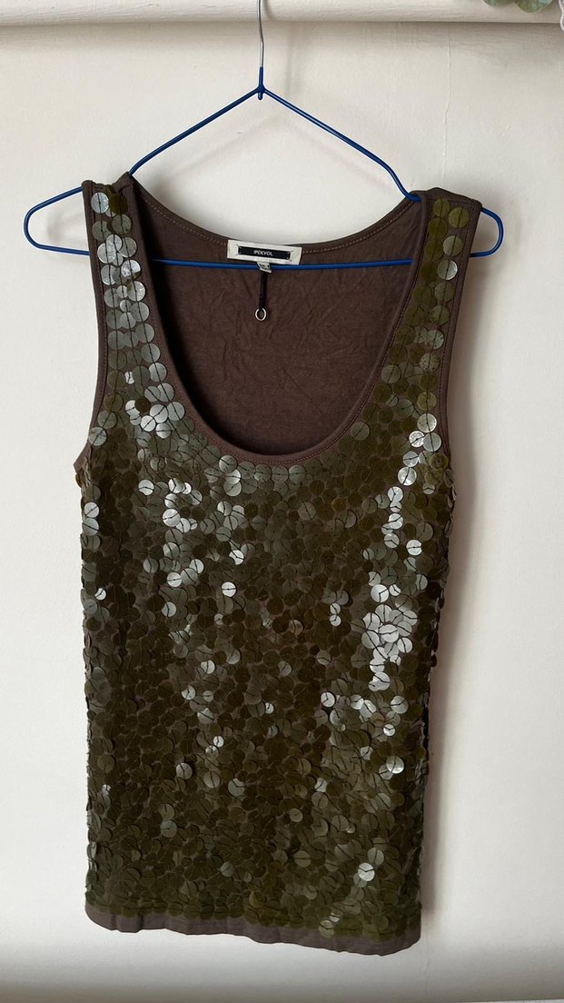 Kahverengi, yuvarlak yakalı, kolsuz ve payetlerle kaplı kadın atlet. Fitted kesim ve normal boyda, günlük ya da parti kullanımı için uygun. ✨