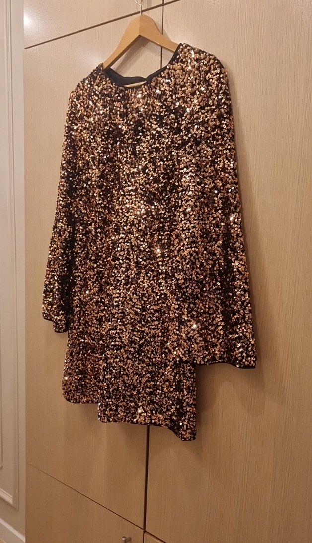 Kahverengi, uzun kollu, bol kesim mini elbise. Payetlerle ve yılan desenli detaylarla süslenmiş, romantik akşamlar için uygun. sadece 1 defa kullanildi temizdir.