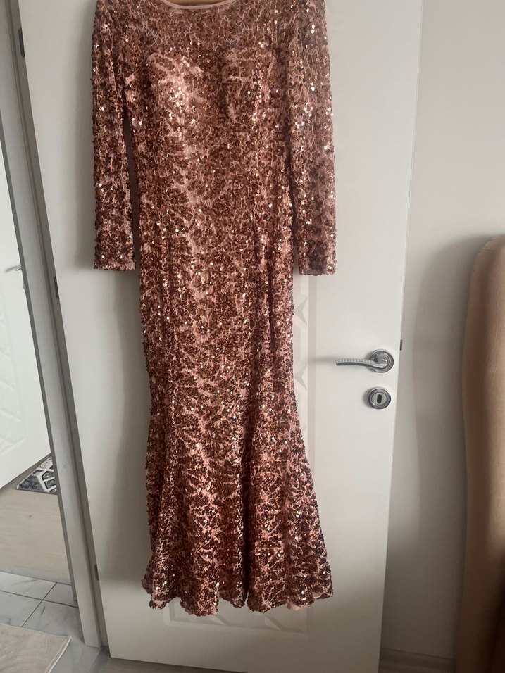 Kahverengi payetli, uzun ve vücuda oturan abiye elbise. Uzun kollu ve kayık yaka detaylı, parlak yılan desenli şık bir tasarım.