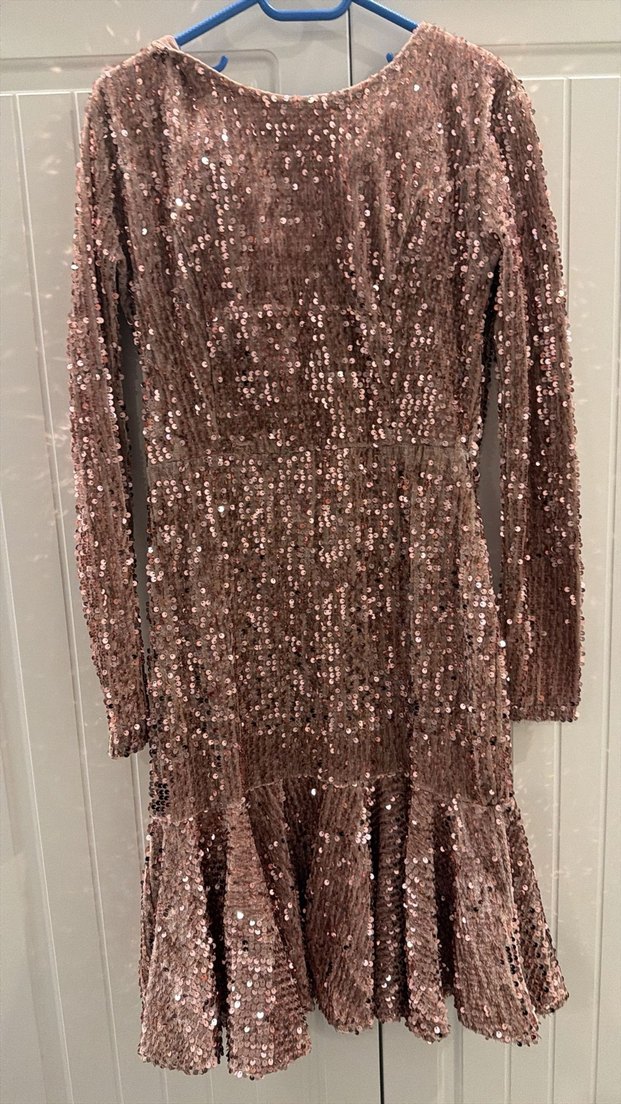 Kahverengi payetli, uzun kollu, balıkçı yaka ve fitted kesim uzun abiye elbise, yılan desenli ve göz alıcı bir tasarıma sahip. ✨40 beden kısa mını dız üstü