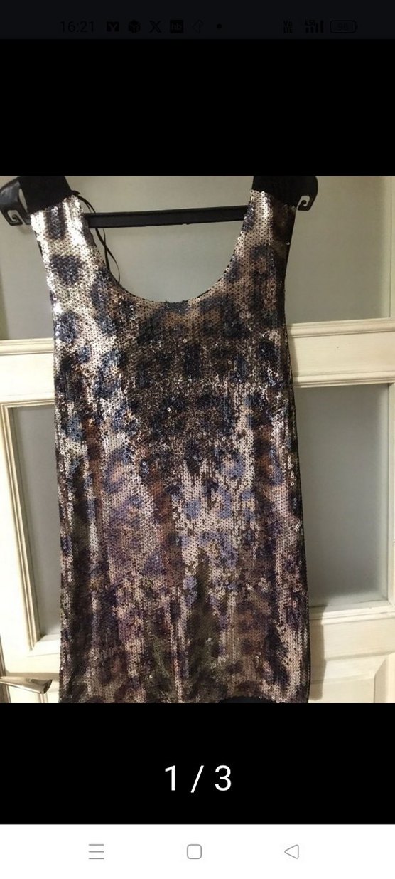 Kahverengi yılan desenli, payetli, kolsuz, V yakalı ve uzun boylu, şık ve bohem tarzda abiye tunik