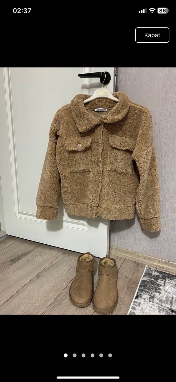 Kahverengi, peluş detaylı, kısa ve bol kesim kadın ceket. Uzun kollu, çentikli yaka ve desen içermeyen rahat bir tasarım. Bedeni xl yazıyor ama o kadar büyük değil