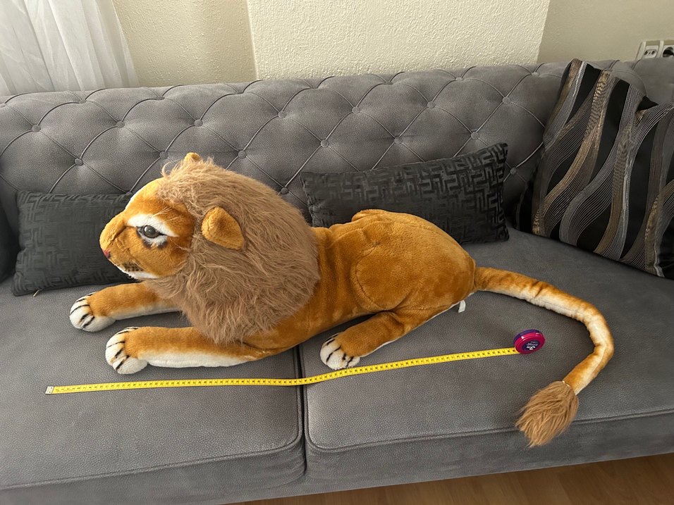 Yumuşak yelesi ve detaylı pençeleri olan koyu kahverengi peluş aslan oyuncak. Boyutu çok büyük oğlumun doğum günü için dekor olarak almıştım fakat normalde de çok severek oynadı boyu kuyruk harıç 85cm fotoğrafta belirttim çok gerçekçi duruyor şoför fiyati 4700civari