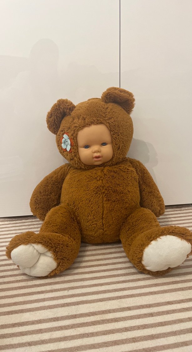 Yumuşak kahverengi peluş ayı oyuncak, bebek yüzü ve yanakta pastel renkli çiçek detayı ile rahat ve sevimli.60 cm