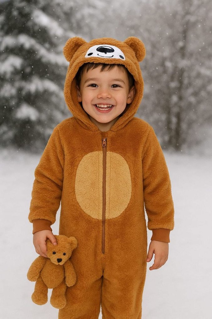 Kahverengi, peluş kumaştan yapılmış, kapüşonunda ayı kulakları ve yüz detayı bulunan sıcak tutan bebek tulumu.