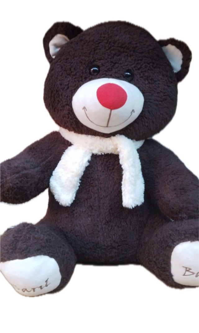 Kahverengi peluş ayı oyuncak, beyaz atkı ve kırmızı burunlu, yumuşak ve sarılmalık .