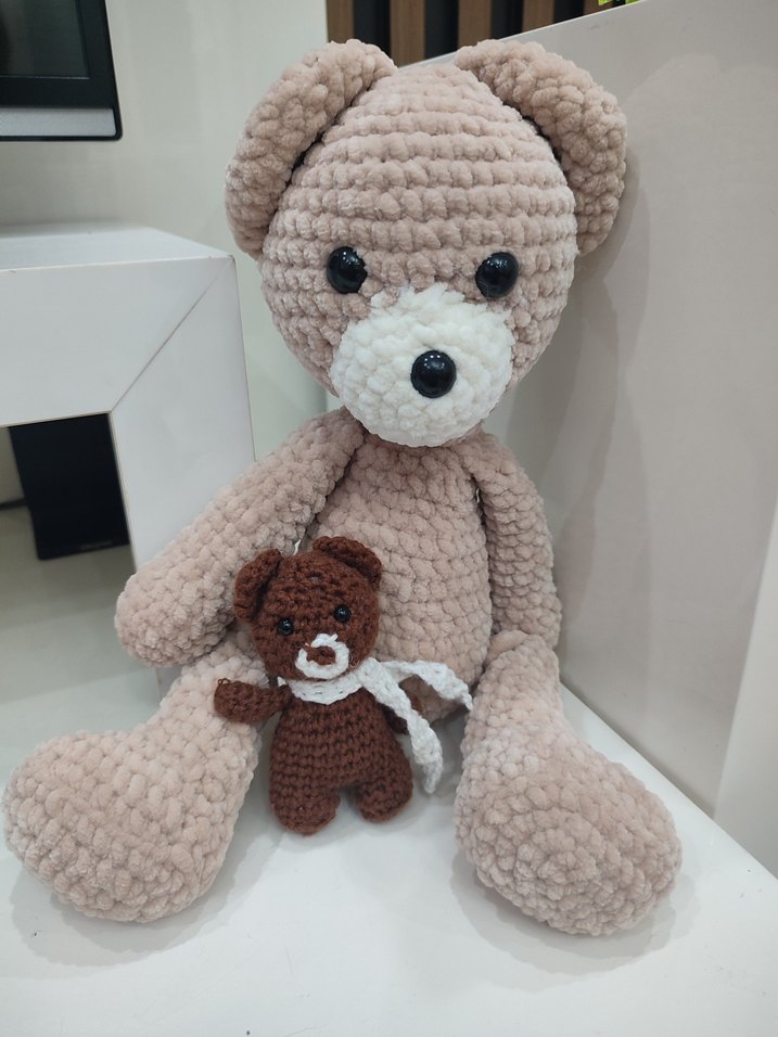Yumuşak kahverengi peluş ayı, büyük gözlü ve beyaz atkılı küçük tığ işi kahverengi ayı ile birlikte. Her ikisi de dokulu ve rahat kumaştan yapılmıştır.