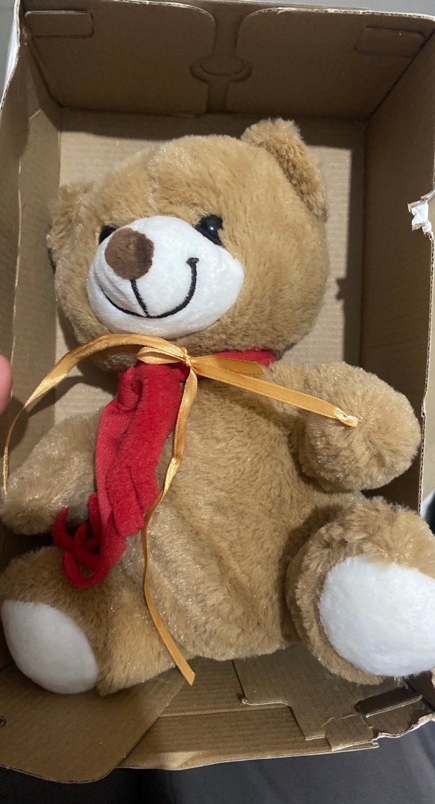 Yumuşak kahverengi peluş ayıcık, kırmızı atkı ve neşeli gülümseme ile. Beyaz patileri ve renkli kurdelesi bulunur.