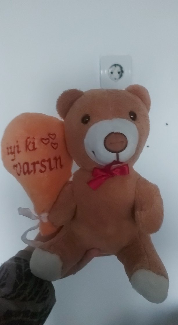 Kahverengi peluş ayıcık, pastel turuncu balon üzerinde "iyi ki varsın" yazısı ile birlikte kırmızı fiyonk ve yumuşak dokuya sahiptir.