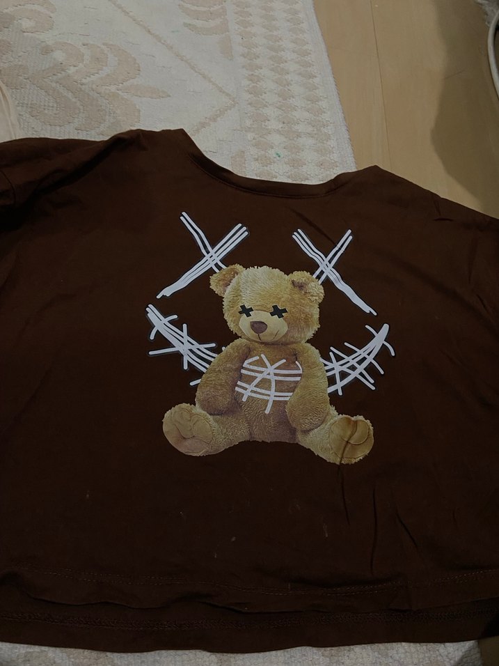 Ön yüzünde yumuşak peluş ayıcık ve dikiş detayları bulunan koyu kahverengi tişört. Rahat ve günlük kullanıma uygun.