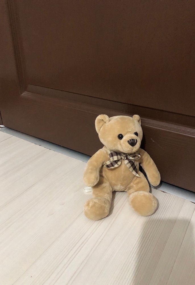 Yumuşak kahverengi peluş ayıcık, ekose fiyonk detaylı, sarılmak ve dekorasyon için uygun.