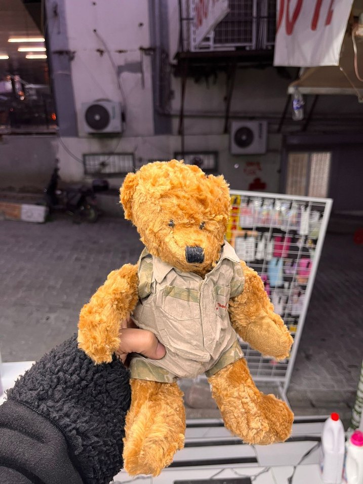 Yumuşak kahverengi peluş ayıcık, bej kıyafetli, sarılmak ve oynamak için uygun.
