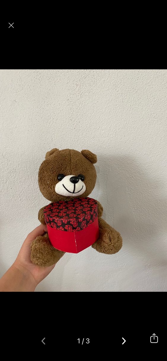 Koyu kahverengi peluş ayıcık, siyah-kırmızı desenli kırmızı kalp şeklinde kutu tutuyor.