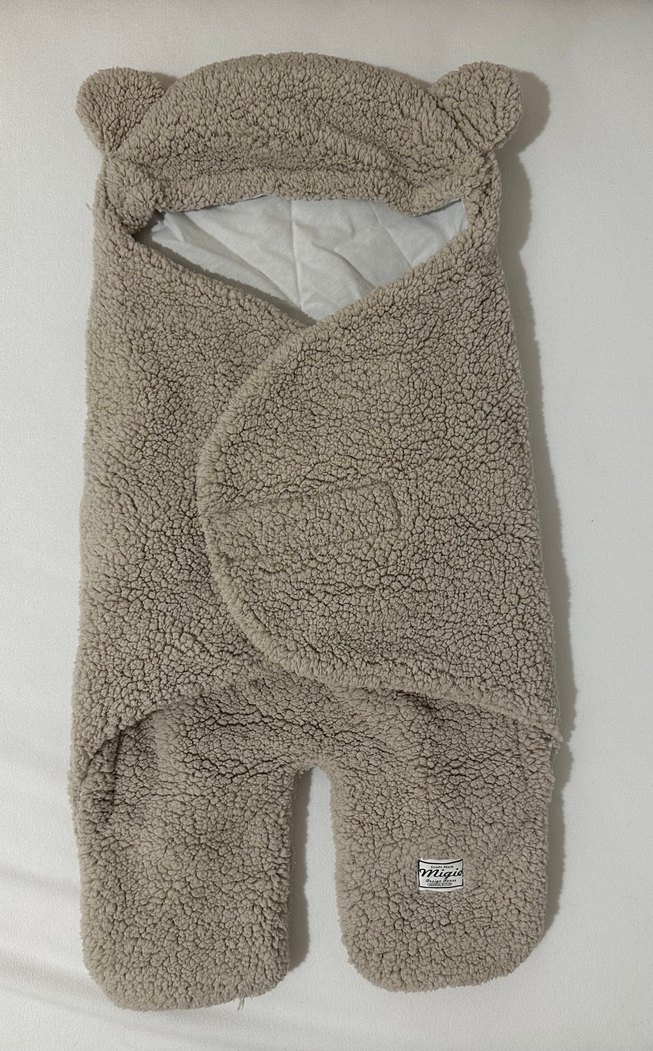 Kahverengi, kulaklı kapüşonlu yumuşak ve sıcak çocuk battaniyesi. Desensiz, rahatlık sağlar. Sadece bir kere 10 dk kadar giyilmiştir . 4-7 ay olarak satış yapılıyordu, biz 3 aylıkken giymiştik.