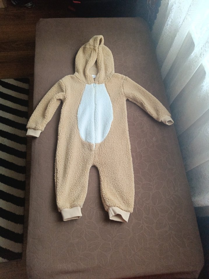 Kahverengi peluş kumaştan, kapüşonlu ve kürk detaylı bebek tulumu. Beyaz ön parça ve manşetleri vardır.