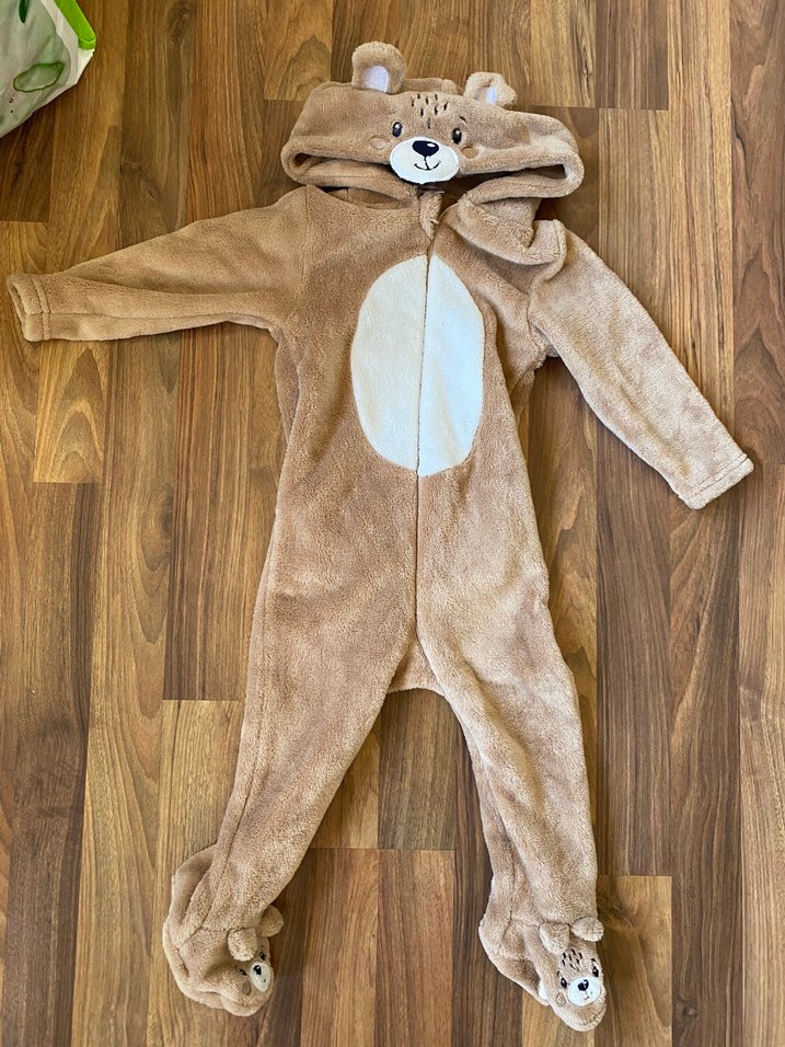 Kahverengi yumuşak ve sıcak bebek tulumu, ayıcık kulaklı ve yüz detaylı kapüşonlu, rahat sokak giyimi için uygundur.