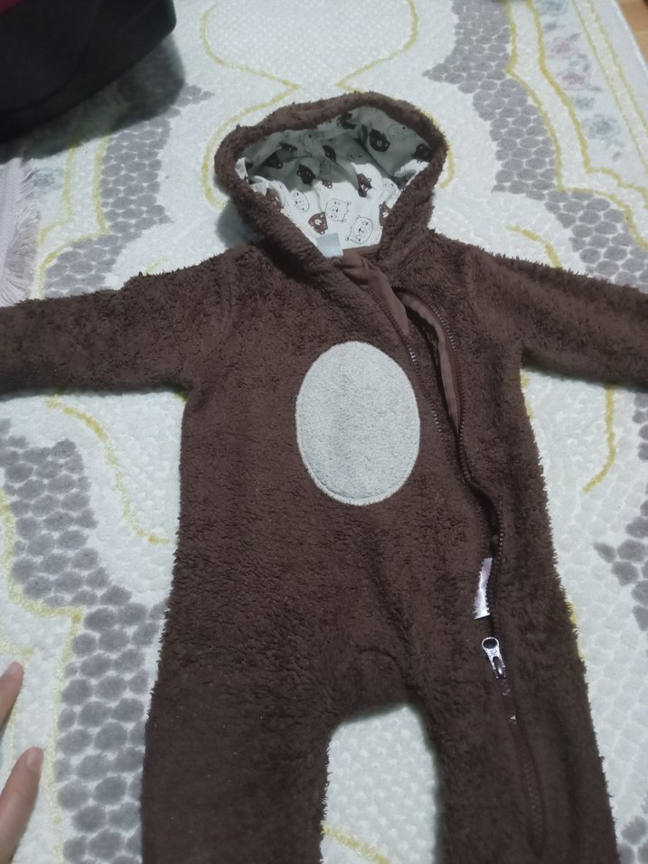 Yumuşak ve sıcak kumaştan kahverengi bebek tulumu, peluş detaylı ve baskılı kapüşonlu, sokak modası tarzında.
