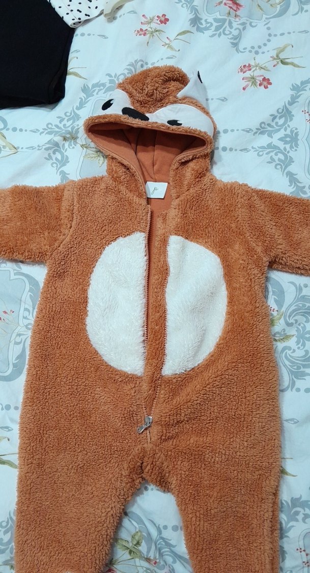 Yumuşak ve sıcak kumaştan, kahverengi peluş bebek tulumu. Kürk detaylı, baskılı ve kulaklı kapüşonlu tasarıma sahip. kız çocuğuna da erkek çocuğuna da olur