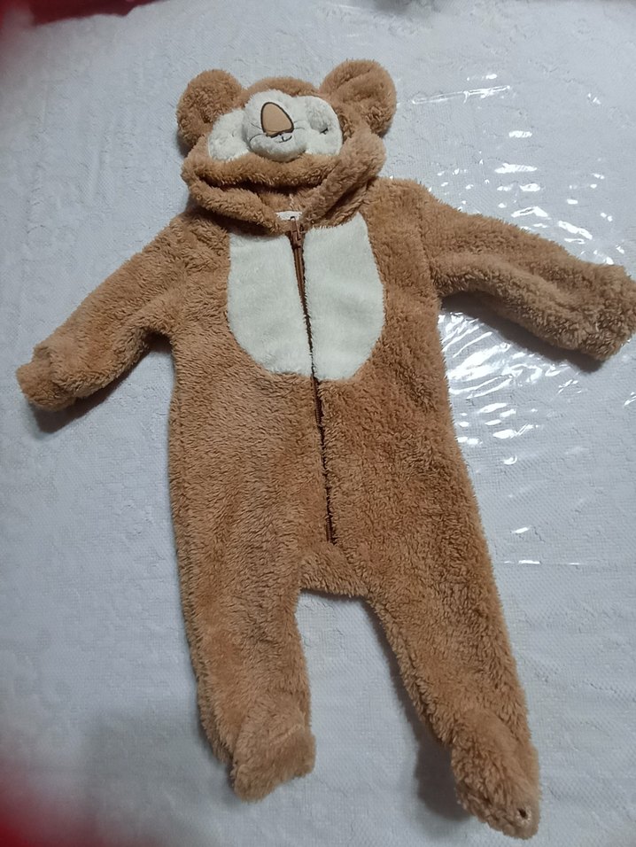 Kahverengi peluş, kürklü detaylı, ayıcık kapüşonlu bebek tulumu. Sıcak tutar.