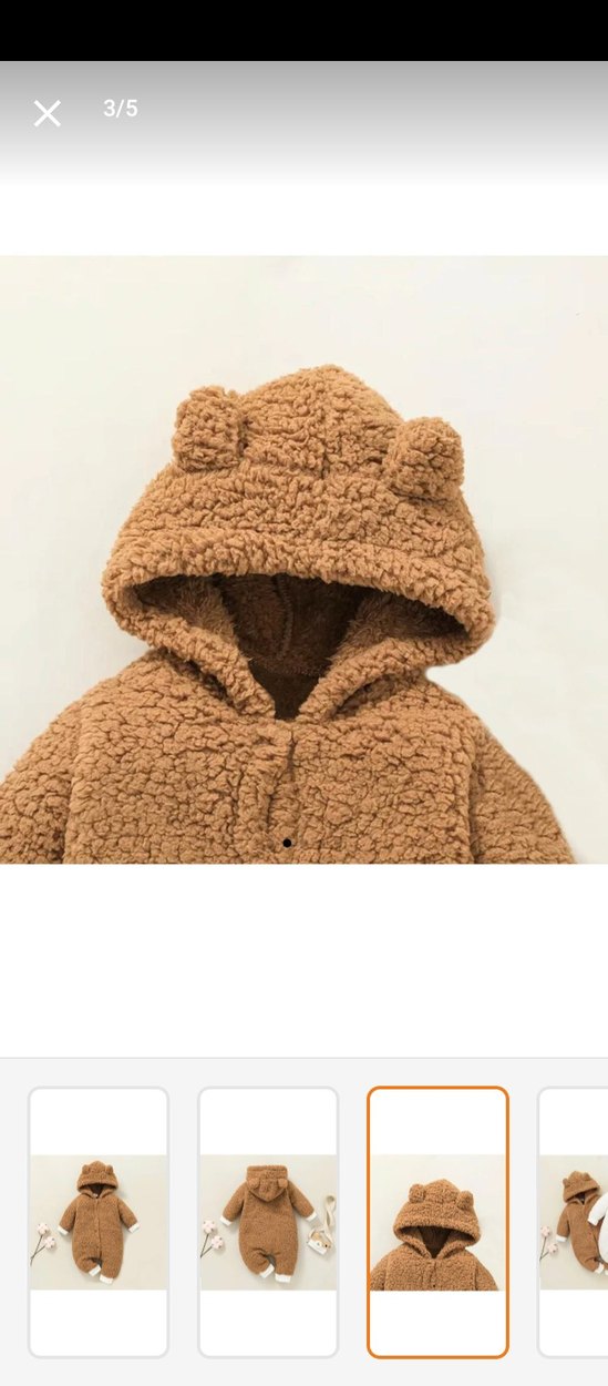Yumuşak ve sıcak kahverengi bebek tulumu, kapüşonunda sevimli peluş detaylar ve ayı kulakları ile sade normcore tarzında tasarlanmıştır.