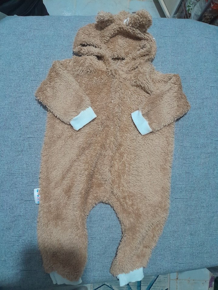 Yumuşak, kahverengi peluş kumaştan yapılmış, kapüşonlu ve ayıcık kulaklı bebek tulumu. Manşetleri lastikli, sokak stili için uygun .