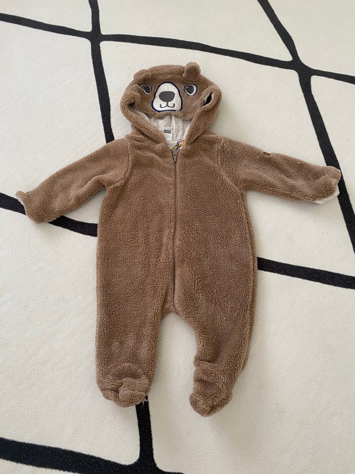 Kahverengi peluş kumaştan yapılmış, kapüşonunda ayı kulakları ve yüz detayı bulunan, sıcak tutan bebek tulumu.
