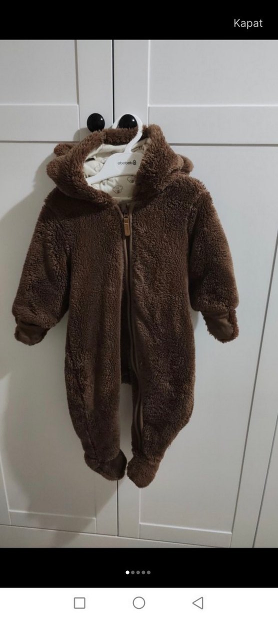 Kahverengi, yumuşak peluş kumaştan yapılmış, kapüşonlu ve kürk detaylı bebek tulumu. Önü fermuarlı ve ayakları kapalıdır.