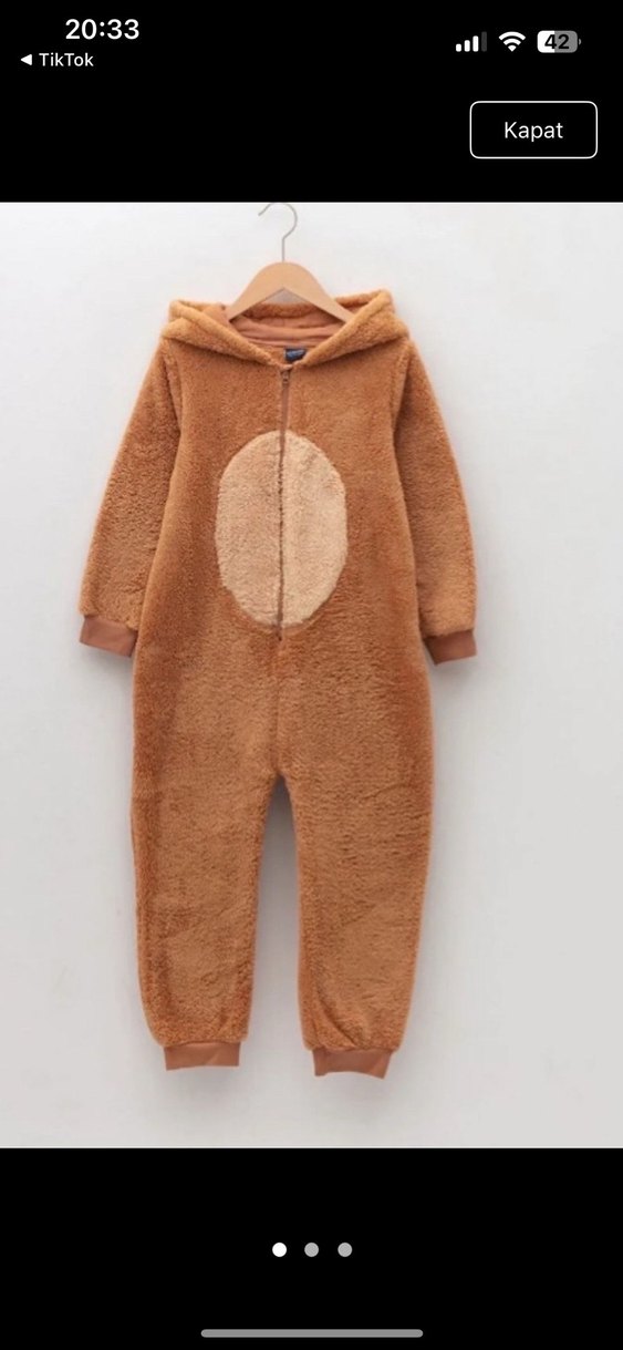 Yumuşak ve sıcak kahverengi peluş kumaştan yapılmış, kapüşonlu ve kürklü detaylı bebek tulumu.