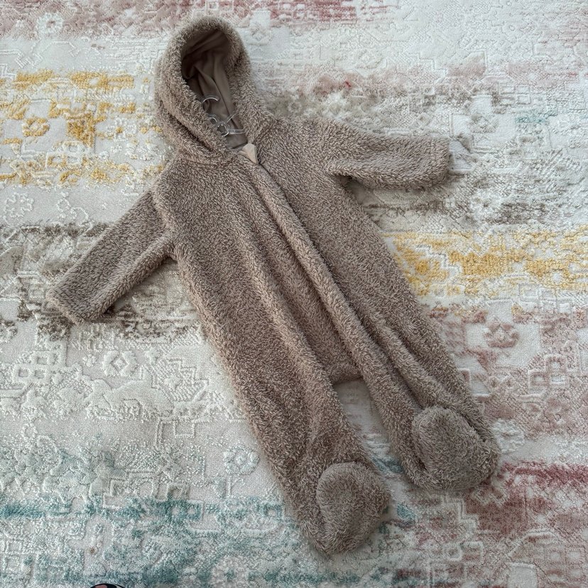 Kapüşonlu kahverengi peluş bebek tulumu, ayaklı. Az kullanıldı Temizdir. 6-9Ay