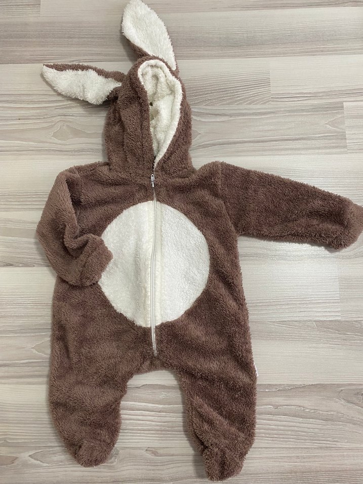 Kahverengi peluş bebek tulumu, nakış detaylı ve kürklü tavşan kulaklı kapüşonlu, ön fermuarlı. Yumuşak ve sıcak tutan tasarım.