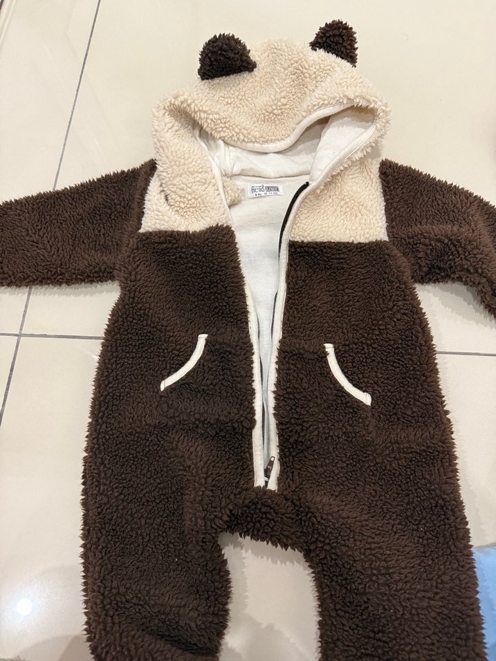 Koyu kahverengi peluş kumaştan yapılmış, kulak detaylı kapüşonlu bebek tulumu. Fermuarlı ve küçük ceplidir. Sokak stili için uygundur.