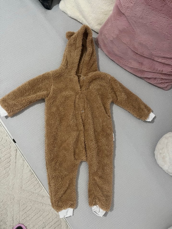 Yumuşak tüylü kahverengi bebek tulumu, kulaklı kapüşon ve gri manşetlerle sade tasarım. Tek parça, rahat ve sıcak tutar. Hiç kullanılmadı. 6