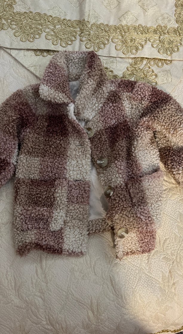 Kahverengi pastel tonlarda tie-dye desenli, peluş dokulu, geniş kesim ve yakası kesik detaylı bohem kız çocuk ceketi. Soeunu yok çok tatlı