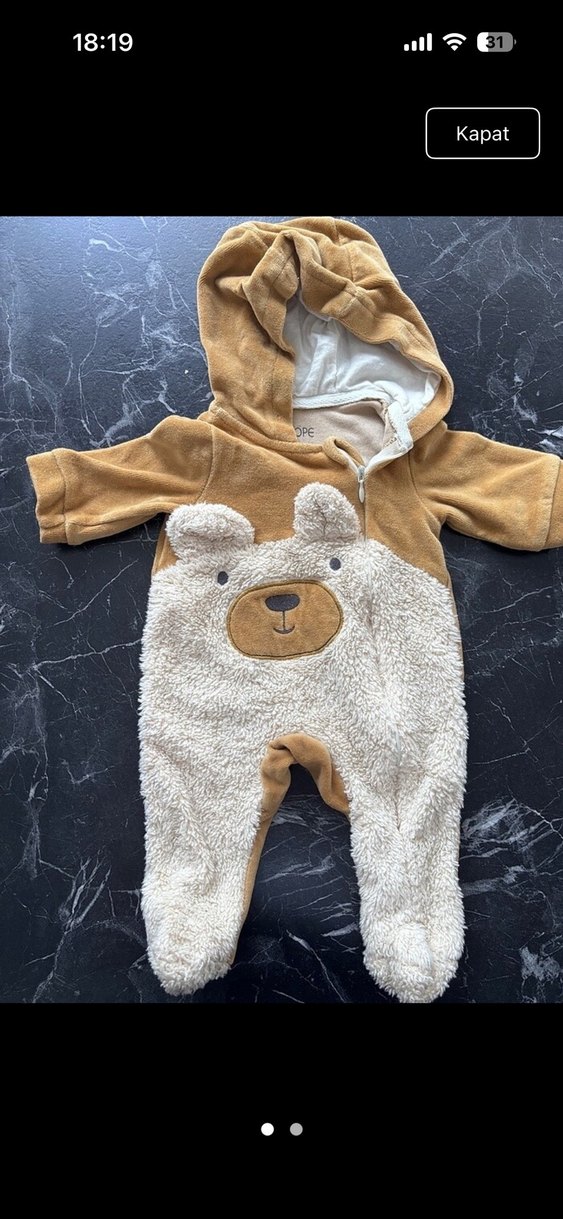 Sıcak tutan peluş kumaştan yapılmış, kapüşonlu kahverengi erkek bebek tulumu. Üzerinde baskılı ayı deseni ve tüylü detaylar bulunur.