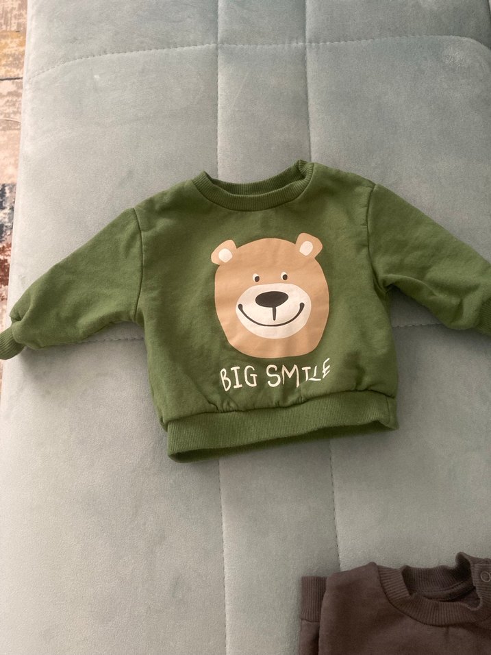 Kahverengi peluş detaylı erkek sweatshirt, yuvarlak yaka, uzun kollu ve bol kesimdir. Yumuşak kumaştan üretilmiş, renkli baskılı ayı yüzü ve "BIG SMILE" yazısı bulunur.