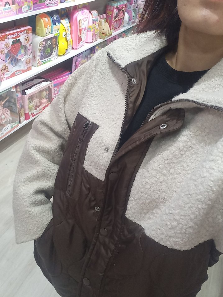 Yumuşak peluş kumaştan yapılmış, kahverengi kadın kışlık ceket. Yüksek yakalı, bol kesim ve uzun kollu, rahat sokak stili için ideal. Bana biraz büyük geldiği için satıyorum yeni hiç bir sorunu yok