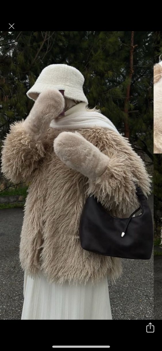 Kahverengi peluş detaylı, bol kesim, uzun kollu ve yüksek yakalı midi boy kadın mont. Rahat ve desen içermeyen sokak stili için uygun.