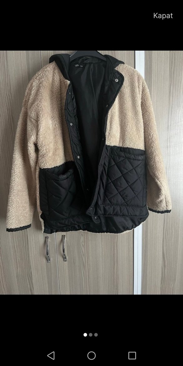 Kahverengi peluş kumaştan, kürk detaylı, notched lapel yakalı ve bol kesim midi uzunlukta kadın ceket. Uzun kollu, günlük kullanıma uygun rahat sokak stili.