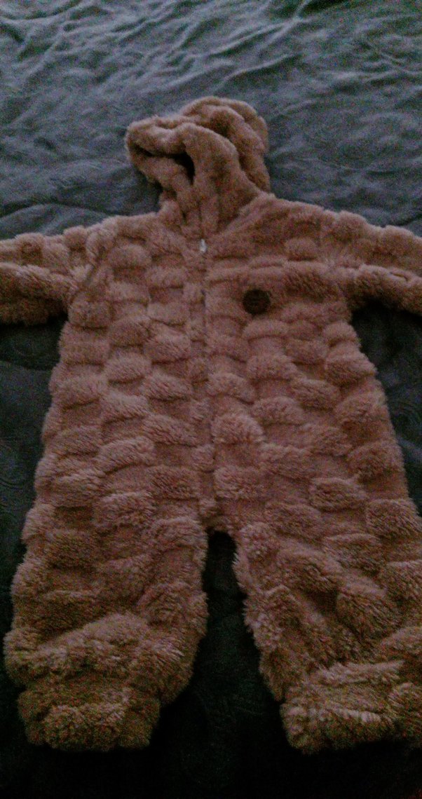 Kahverengi, yumuşak peluş kumaşlı, kapüşonlu erkek bebek tulumu. Düz, desen içermeyen ve normcore tarzda tasarlanmıştır. ❄️