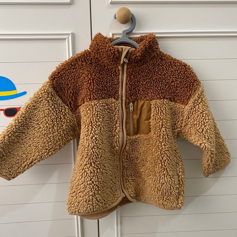 Erkek çocuk için kahverengi, peluş kumaştan yapılmış, gevşek kesim, yakasında kesik yakalı ve kürk detaylı ceket. Önünde fermuarlı cep bulunur.