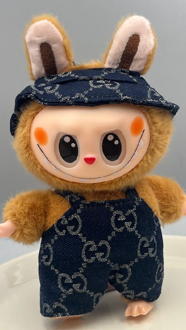 Kıyafetli labubu Koyu desenli kıyafet ve şapka giymiş, büyük gözlü ve gülümseyen yüzlü kahverengi peluş tavşan oyuncak.