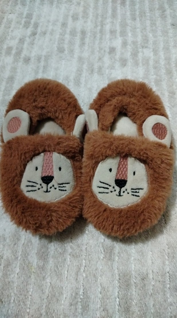 Kahverengi, yumuşak ve sıcak kumaştan yapılmış, kürk detaylı ve sevimli hayvan yüzü desenli terlikleri.