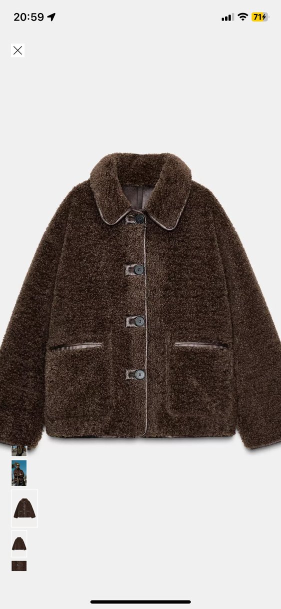 Kahverengi, peluş kumaştan yapılmış, bol kesim uzun kollu kadın ceket. Kürk detaylı ve iki ön cepli, günlük rahatlık sağlar. Çift taraflıdır Hiçbir kusuru yok yenidir