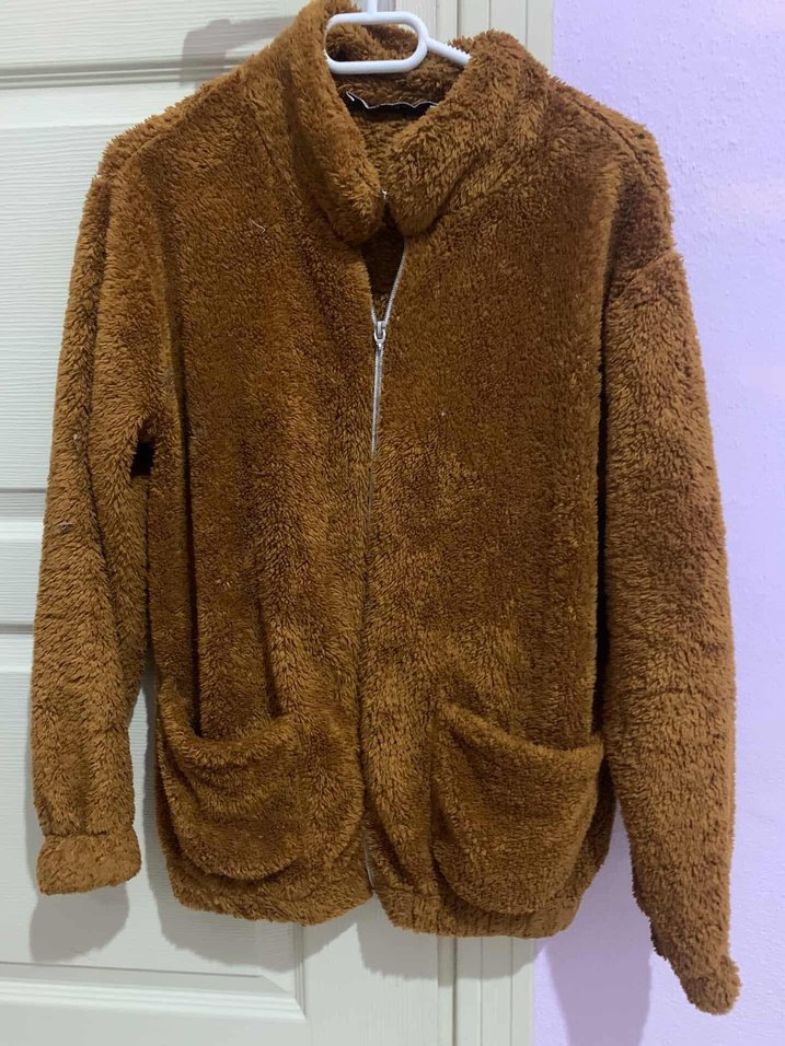 Kahverengi, yumuşak ve sıcak kumaştan yapılmış, kürk detaylı bol kesim ceket. Çentikli yaka, uzun kollu ve iki ön cep içerir. Günlük rahat kullanım için uygundur.