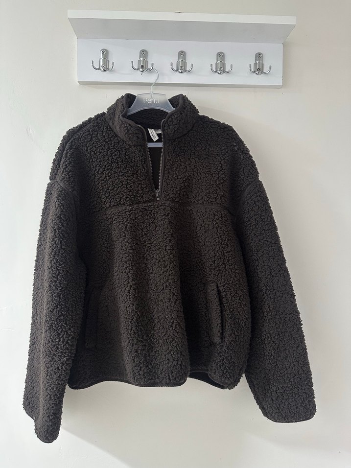 Kahverengi peluş kumaştan, yarım fermuarlı, yüksek yakalı, uzun kollu, bol ve normal boy kadın ceket. Günlük rahat kullanıma uygundur.