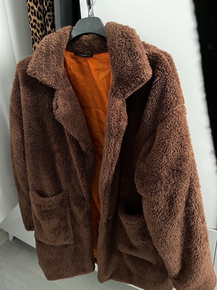 Kahverengi peluş kumaştan, kürk detaylı, uzun kollu ve kesik yakalı kadın kaban. Salaş kesimi ve midi boyuyla bohem tarzına uygun, rahat bir parça.