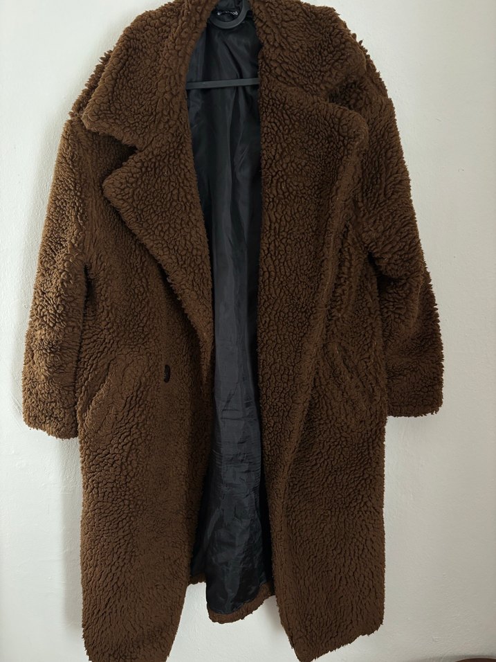 Kahverengi peluş kumaştan, notched lapel yakalı ve uzun kollu midi uzunlukta, bol kesim kadın kaban. Kürk dokusu sıcaklık sağlar. Goruldugu gibi kullanilmiyor duruyor o yuzden koydum