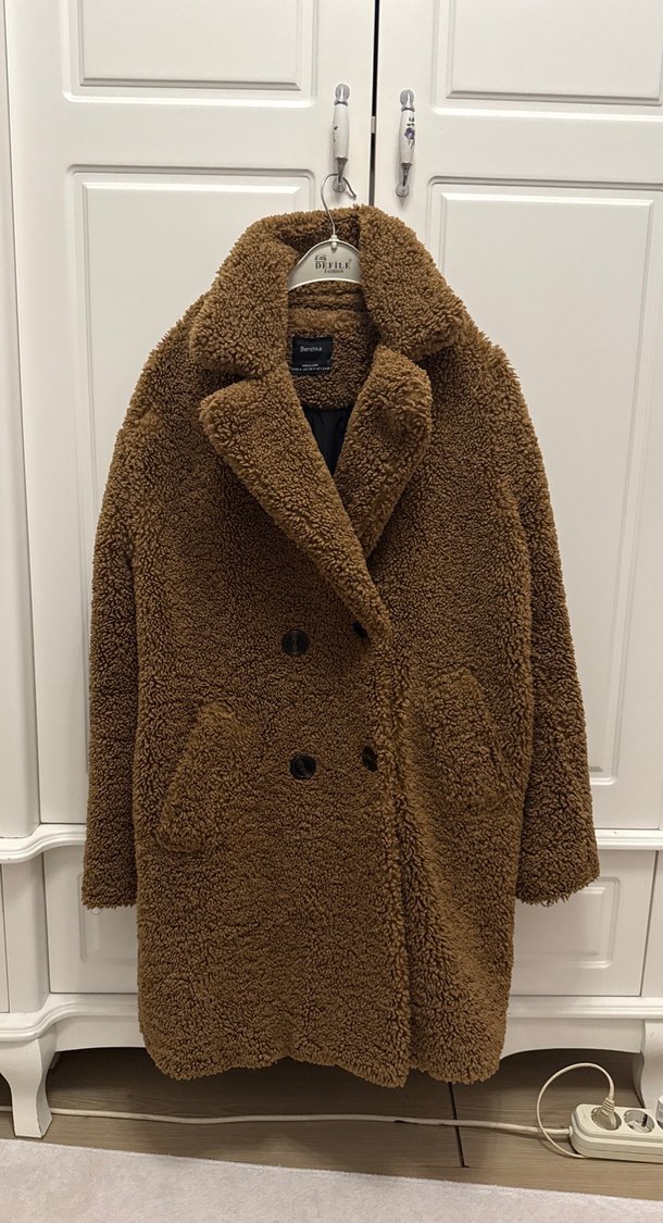 Kahverengi peluş kumaştan, kürk detaylı, geniş kesim, uzun kollu ve normal boy midi kadın kaban.