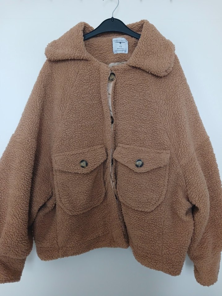 Kahverengi, peluş kumaştan, uzun kollu ve geniş kesim kısa ceket. Yaka detayı ve tüylü dokusuyla rahat ve pastel tonlarda günlük kullanım için uygun.