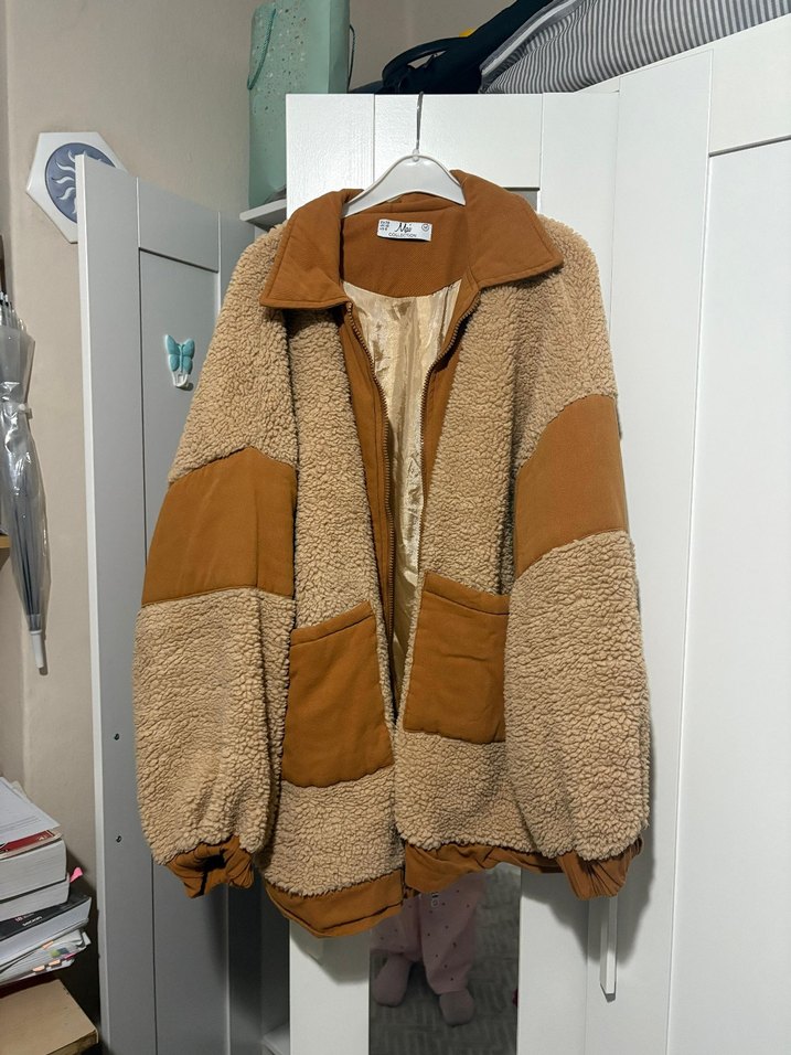 Kahverengi peluş kumaştan, bol kesim ve uzun kollu midi ceket. Cepler ve kollar peluş detaylı, notched lapel yakalı, rahat sokak stili için uygun. #peluş